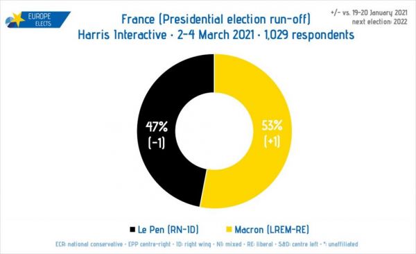 Οι περισσότερες δημοσκοπήσεις δείχνουν ότι, όπως συνέβη το 2017, έτσι και του χρόνου στον δεύτερο και καθοριστικό γύρο θα αναμετρηθούν και πάλι ο Γάλλος πρόεδρος και η αρχηγός της γαλλικής ακροδεξιάς, Μαρίν Λεπέν.