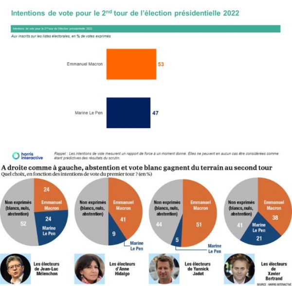 Σύμφωνα με την Harris Interactive, πάντως, οι μισοί ψηφοφόροι της λένε ότι θα απέχουν στον δεύτερο γύρο και από τους υπόλοιπους μισούς, το 41% λέει ότι θα ψηφίσει τον Μακρόν και το 9% τη Λεπέν.