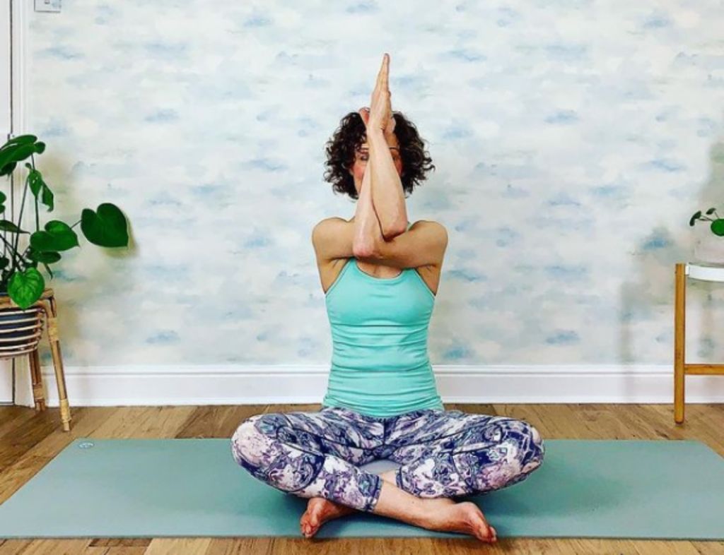 * Σταθείτε όρθιοι και λυγίστε το δεξί πόδι με τέτοιον τρόπο ώστε το πέλμα να ακουμπά κατά μήκος της εσωτερικής πλευράς του αριστερού μηρού. Ενώστε τις παλάμες μπροστά στο στήθος και μετά σηκώστε τες ψηλά. Μείνετε σε αυτή τη θέση παίρνοντας 6 ανάσες.
