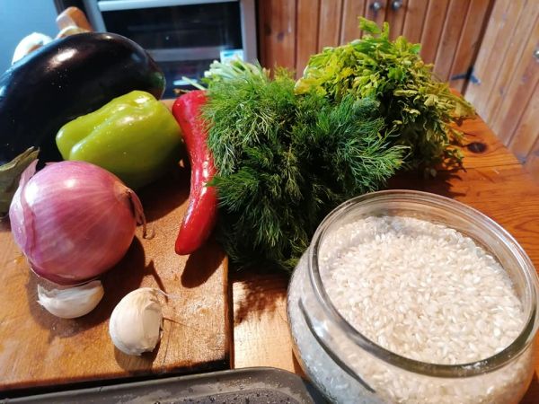 500 γρ ρύζι γλασε ή καρολίνα Δύο μέτρια κρεμμύδια Δύο σκελίδες σκόρδο Μια πράσινη και μια κόκκινη πιπεριά Άνιθο και μαϊντανό 3-4 κλωνάρια Αλάτι, πιπέρι, κουρκουμά (προαιρετικά), 3-4 κόκκους μπαχάρι