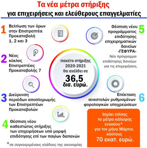 Έτσι, τα μέτρα προβλέπονυ κούρεμα στους πρώτους τρεις κύκλους της επιστρεπτέας προκαταβολής, που μπορεί να φτάσει μέχρι και το 65% του κρατικού δανείου, επιδότηση παγίων δαπανών με τη μορφή συμψηφισμών με μελλοντικές φορολογικές και ασφαλιστικές υποχρεώσεις, αλλά και επιδότηση των επιχειρηματικών δανείων και μεταφορά δόσεων σε ρυθμίσεις οφειλών προς την εφορία και στα ασφαλιστικά ταμεία.