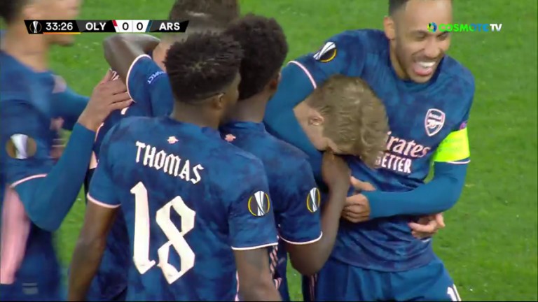 Στο 34′ η Άρσεναλ προηγήθηκε με 1-0 του Ολυμπιακού χάρη σε πολύ δυνατό σουτ του Μάρτιν Όντεγκαρντ που δεν μπόρεσε να αποκρούσει ο Σα.