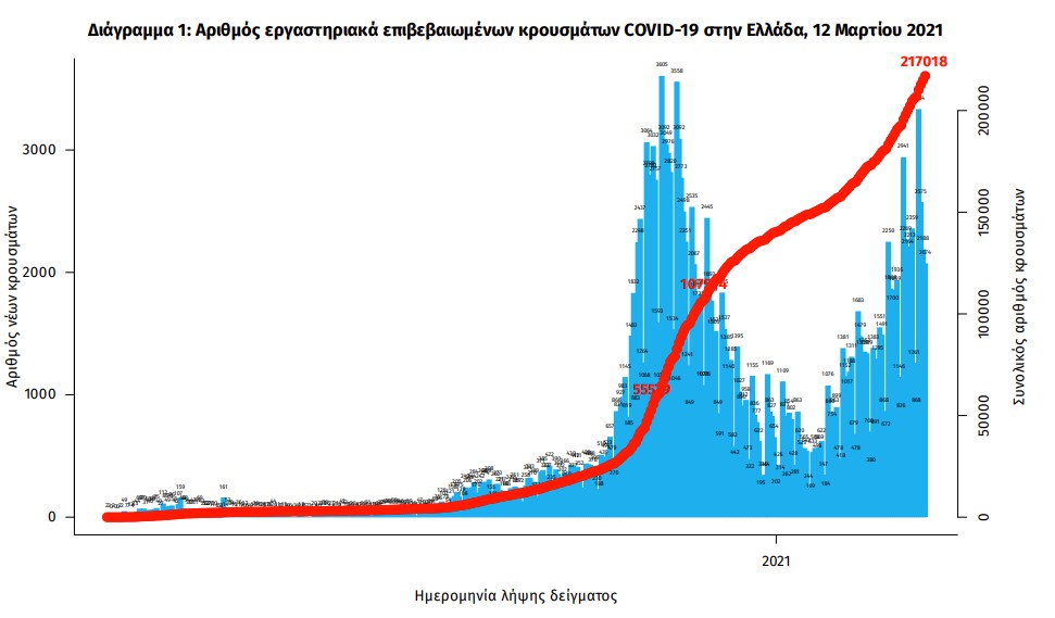 Τα νέα εργαστηριακά επιβεβαιωμένα κρούσματα της νόσου που καταγράφηκαν τις τελευταίες 24 ώρες είναι 2.405, εκ των οποίων 14 εντοπίστηκαν κατόπιν ελέγχων στις πύλες εισόδου της χώρας. Ο συνολικός αριθμός των κρουσμάτων ανέρχεται σε 217.018 (ημερήσια μεταβολή +1.1%), εκ των οποίων 51.6% άνδρες