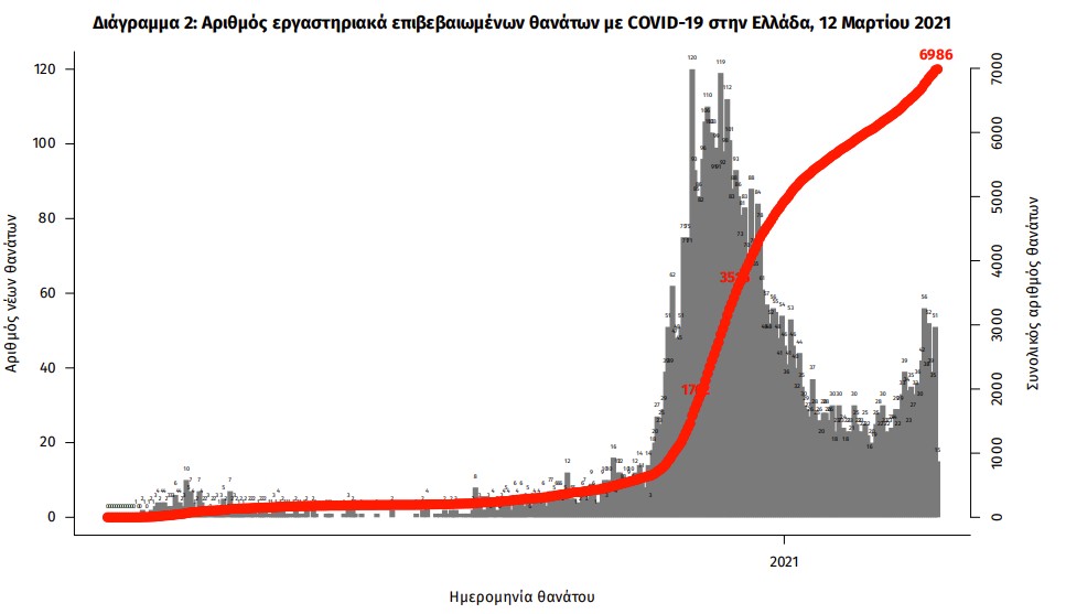 Οι νέοι θάνατοι ασθενών με COVID-19 είναι 49, ενώ από την έναρξη της επιδημίας έχουν καταγραφεί συνολικά 6.986 θάνατοι. Το 95.8% είχε υποκείμενο νόσημα ή/και ηλικία 70 ετών και άνω.