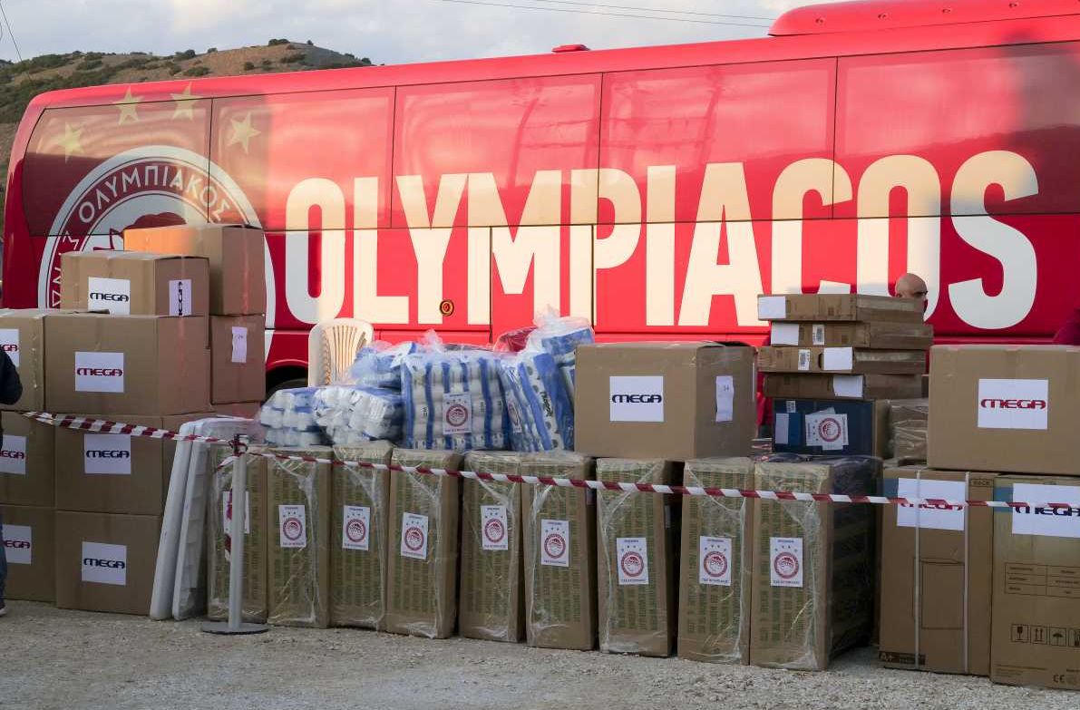 Οι κάτοικοι υποδέχονται με ενθουσιασμό το πούλμαν του Ολυμπιακού γεμάτο με κουβέρτες, τρόφιμα καθώς και είδη καθαρισμού, αλλά και τα φορτηγά με τους 4 οικίσκους.