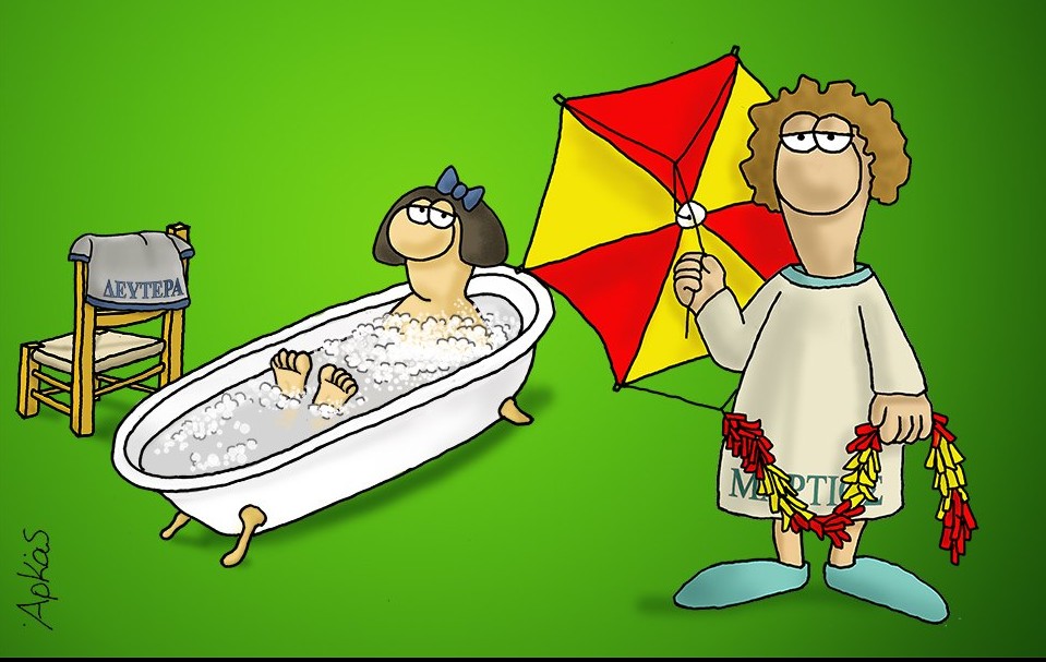 Στο σκίτσο βλέπουμε τη Δευτέρα να κάνει το μπάνιο της, ενώ ο Μάρτιος κρατά τον χαρταετό.