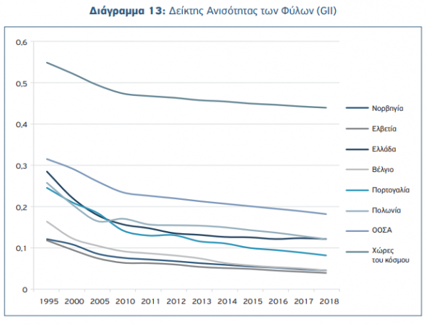 Επιπλέον, ως προς τον Δείκτη Ανισότητας των Φύλων (Gender Inequality Index), με τιμή για τη χώρα μας 0,122, η Ελλάδα κατατάσσεται στην 31η θέση μεταξύ των συνολικά 162 χωρών για τις οποίες έχει υπολογιστεί ο συγκεκριμένος δείκτης για το 2018, ενώ έχει τιμή χαμηλότερη του μέσου όρου 0,182 που ισχύει για τις χώρες του ΟΟΣΑ.