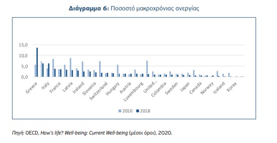 Η μακροχρόνια ανεργία υπολογίζεται βάσει του αριθμού των ατόμων που είναι άνεργα εδώ και έναν χρόνο ή και για μεγαλύτερο χρονικό διάστημα, έχουν κάνει κινήσεις εύρεσης εργασίας τις προηγούμενες τέσσερις εβδομάδες και μπορούν να ξεκινήσουν να εργάζονται μέσα σε δύο εβδομάδες στην περίπτωση που βρουν δουλειά. Σύμφωνα με τα δεδομένα του ΟΟΣΑ, οι περισσότερες περιπτώσεις ανεργίας είναι σε γενικές γραμμές βραχύβιες. Η μακροχρόνια ανεργία, ακόμη και αν είναι λιγότερο συχνή, μπορεί να συμβάλει ακόμη περισσότερο στη μείωση της ευδαιμονίας των οικογενειών και των ατόμων. Για όλες τις χώρες του ΟΟΣΑ, το 2,1% του ενεργού πληθυσμού είναι άνεργοι/ες για έναν χρόνο ή και περισσότερο. Η περίπτωση της Ελλάδας είναι εν προκειμένω συγκρίσιμη με την κατάσταση που επικρατεί στη Νότια Αφρική, όπου τα ποσοστά μακροχρόνιας ανεργίας είναι ύψους 14% και 17% αντίστοιχα. Από το 2010, το ποσοστό της μακροχρόνιας ανεργίας έχει μειωθεί κατά περίπου 1% κατά μέσο όρο για όλες τις χώρες του ΟΟΣΑ. Οι επιπτώσεις της κρίσης είχαν τον πιο ισχυρό αντίκτυπο στην Ελλάδα (+7 μονάδες), στη Νότια Αφρική (+3 μονάδες) και στην Ιταλία (+2μονάδες). Για τους Έλληνες, η ανεργία αυξήθηκε δραματικά την περίοδο από το 2010 έως το 2020, ως επακόλουθο της οικονομικής κρίσης που ξεκίνησε το 2008 και των πολιτικών λιτότητας που εφαρμόστηκαν στη συνέχεια.