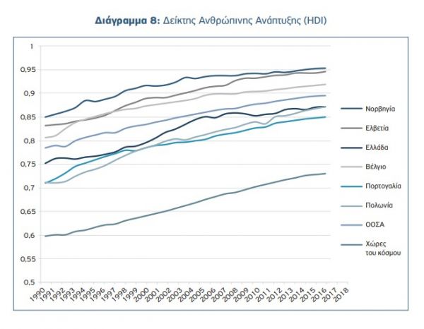 Οι συγγραφείς της μελέτης επέλεξαν να αναδείξουν κάποιους δείκτες, που προέκυψαν από την ανάλυση των βάσεων του ΟΗΕ σχετικά με την ανθρώπινη ανάπτυξη. Βάσει αυτών, η τιμή του Δείκτη Ανθρώπινης Ανάπτυξης (Human Development Index) της Ελλάδας για το 2018 είναι 0,872, τοποθετώντας τη χώρα μας στην κατηγορία πολύ υψηλής ανθρώπινης ανάπτυξης, και στην 32η θέση μεταξύ των 189 χωρών. Μεταξύ 1990 και 2018, η τιμή του Δείκτη Ανθρώπινης Ανάπτυξης της Ελλάδας αυξήθηκε από 0,753 σε 0,872 (σημειώνοντας μια αύξηση της τάξης του 15,8%), δηλαδή χαμηλότερη της αντίστοιχης τιμής του μέσου όρου του 0,895 που ισχύει για τις χώρες του ΟΟΣΑ.