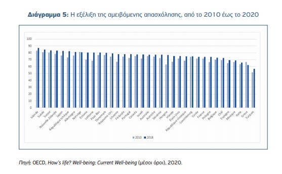 Όσον αφορά την εξέλιξη της αμειβόμενης απασχόλησης κατά την τελευταία αυτή περίοδο, 2010-2017, σημειώνεται μια μικρή αύξηση σε όλες τις χώρες μέλη του ΟΟΣΑ. Το 2010, το ποσοστό αυτό ήταν 71,9% και το 2018 76,5%. Στην περίπτωση της Ελλάδας, η αλλαγή που παρατηρήθηκε για την ίδια περίοδο κινήθηκε προς την αντίθετη κατεύθυνση. Το 2010, το ποσοστό αμειβόμενης απασχόλησης στην Ελλάδα ήταν 66,6%, ενώ το 2018 μόνο το 62,3% των Ελλήνων και των Ελληνίδων είχαν την τύχη να απασχολούνται σε μια αμειβόμενη θέση εργασίας. Το ποσοστό απασχόλησης ορίζεται εδώ ως το ποσοστό του ενήλικου πληθυσμού (ηλικίας 25 έως 64 ετών) που δήλωσαν ότι είχαν εργαστεί έναντι αμοιβής τουλάχιστον μία ώρα την εβδομάδα που προηγήθηκε της έρευνας. Η Ελλάδα και η Βραζιλία είναι οι δύο χώρες όπου το ποσοστό των εργαζομένων υποχώρησε κατά τέσσερις μονάδες μετά το 2010.
