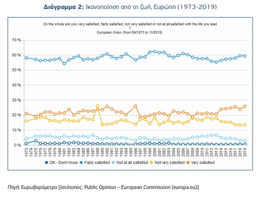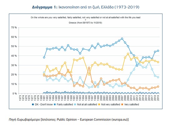 Η μελέτη ξεκινά εξετάζοντας την ικανοποίηση απέναντι στη ζωή, έναν δείκτη που χρησιμοποιείται ευρύτατα στην κοινωνιολογία της ευτυχίας. Η περίοδος 2007-2012 φαίνεται ιδιαίτερα κρίσιμη και ακολουθείται από μια σταθεροποίηση και στη συνέχεια από μια σταδιακή βελτίωση έως το 2019. Αυτές οι πολύ σημαντικές εξελίξεις θα πρέπει να αντιπαραβληθούν με τη σχετική σταθερότητα του δείκτη στην κλίμακα της Ευρωπαϊκής Ένωσης (όπου η μείωση την περίοδο 2007-2012 είναι πολύ μετριασμένη σε σύγκριση με την περίπτωση της Ελλάδας και όπου η αύξηση από το 2013 κι έπειτα είναι πολύ ασθενής).