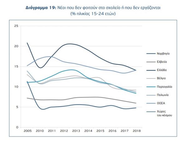 Επίσης, η τιμή του ποσοστού των νέων που δεν φοιτούν στο σχολείο ή που δεν εργάζονται (% ηλικίας 15-24 ετών) στην Ελλάδα για το 2018 είναι 14,1%, δηλαδή υψηλότερη του μέσου όρου του 12,6% που ισχύει για χώρες που ανήκουν στην ομάδα της πολύ υψηλής ανθρώπινης ανάπτυξης και του μέσου όρου του 13,2% που ισχύει για χώρες του ΟΟΣΑ. Η πορεία του δείκτη ειδικότερα έχει ως εξής: το 2005 κυμαίνεται στο 20,8%, το 2010 στο 14,8%, το 2015 στο 17,2% και, τέλος, το 2018 μειώνεται στο 14,1%.