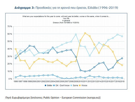 Ξαναβρίσκουμε ένα παρόμοιο σχήμα εξέλιξης όσον αφορά την αισιοδοξία και την απαισιοδοξία, με μια ραγδαία πτώση της αισιοδοξίας μετά το 2008, μια αργή επανεκκίνησή της από το 2013, ξανά μια διακοπή της ανόδου της το 2016 και στη συνέχεια μια κατάσταση που βελτιώνεται. Και πάλι, η ελληνική κατάσταση έρχεται σε αντίθεση με αυτήν της ΕΕ στο σύνολό της κατά την ίδια περίοδο, μαρτυρώντας μια μορφή συλλογικής υποκειμενικής υποβάθμισης πλατιάς εμβέλειας. Αυτή η υποβάθμιση, για άλλη μια φορά, είναι η ένδειξη μιας δομικής κοινωνικής αλλαγής την οποία οι δημογραφικοί και μακροοικονομικοί δείκτες αδυνατούν να εξηγήσουν επαρκώς. Ο «κοινωνικός ισολογισμός» είναι σε γενικές γραμμές πιο αρνητικός από όσο αφήνουν να εννοηθεί ορισμένοι επίσημοι δείκτες οι οποίοι αναπαράγονται από τα μέσα μαζικής ενημέρωσης.