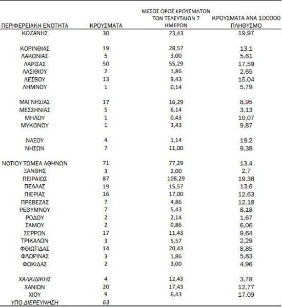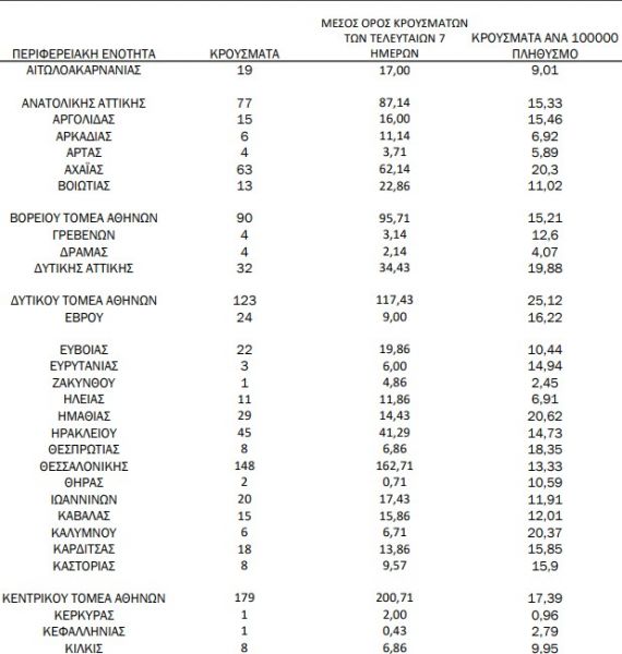 Επιπλέον, 123 κρούσματα δίνει ο Δυτικός Τομέας Αθηνών, 87 ο Πειραιάς, 90 ο Βόρειος Τομέας Αθηνών και 77 η Ανατολική Αττική.