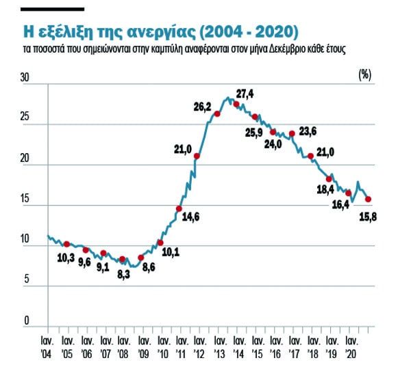 Στο 15,8% υποχώρησε τον Δεκέμβριο του 2020 το εποχικά διορθωμένο ποσοστό ανεργίας, από 16,4% τον Δεκέμβριο του 2019 και 16,2% τον Νοέμβριο του 2020, σύμφωνα με τα στοιχεία της Ελληνικής Στατιστικής Αρχής.