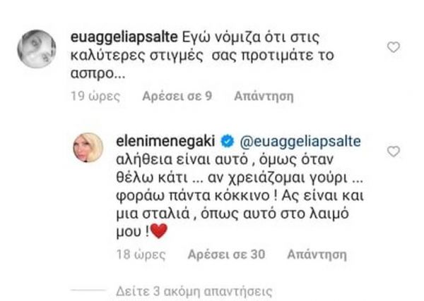 Και η Ελένη απάντησε: «Αλήθεια είναι αυτό… όμως όταν θέλω κάτι, όταν χρειάζομαι ένα γούρι, φοράω πάντα κόκκινο. Ας είναι και μία σταλιά όπως αυτό στο λαιμό μου…»!