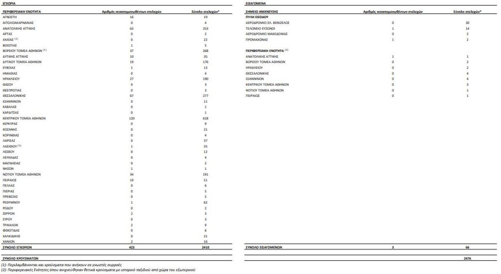 Συνολικά έχουν ταυτοποιηθεί 2.476 θετικά για την παρουσία μετάλλαξης Β.1.1.7/UK lineage (Variant VOC_202012) (Πίνακας 4) και 55 θετικά για την παρουσία μετάλλαξης B.1.351/South Africa (Variant 501.V2) από την έναρξη λειτουργίας του Εθνικού Δικτύου Γονιδιωματικής Επιτήρησης για τις μεταλλάξεις του SARS- CoV-2 έως σήμερα.