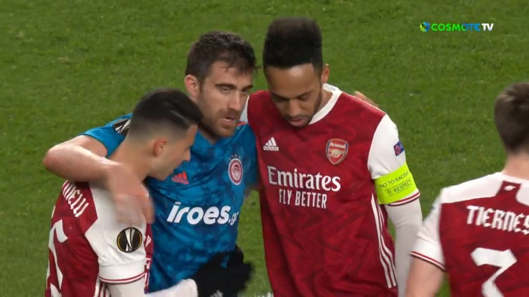 Μετά το τελευταίο σφύριγμα, ο Έλληνας κεντρικός αμυντικός του Ολυμπιακού είχε την ευκαιρία να τα… πει με τους πρώην συμπαίκτες του στην Άρσεναλ και φυσικά το εκμεταλλεύτηκε.