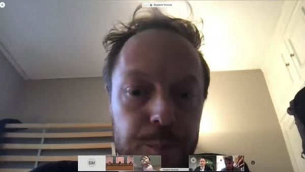 «Τομ μας ακούς; Σε βλέπουμε αλλά δεν σε ακούμε. Μπορείς μήπως να ανοίξεις το μικρόφωνό σου;», ρώτησε η συντονίστρια τον δημοσιογράφο που είχε ζητήσει τον λόγο.