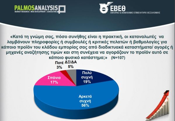 Αντίστροφα, «Πολύ» και «Αρκετά» συχνή είναι η πρακτική ορισμένων καταναλωτών να λαμβάνουν πληροφορίες ή συμβουλές ή κριτικές πελατών και βαθμολογίες για προϊόντα από διαδικτυακά καταστήματα ή μηχανές αναζήτησης τιμών και στη συνέχεια να αγοράζουν τα προϊόντα αυτά από φυσικά καταστήματα, σύμφωνα με το 75% των ερωτηθέντων.