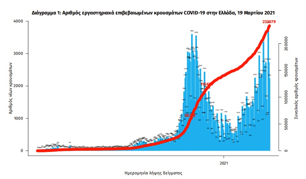 Τα νέα εργαστηριακά επιβεβαιωμένα κρούσματα της νόσου που καταγράφηκαν τις τελευταίες 24 ώρες είναι 2.785, εκ των οποίων 16 εντοπίστηκαν κατόπιν ελέγχων στις πύλες εισόδου της χώρας. Ο συνολικός αριθμός των κρουσμάτων ανέρχεται σε 233.079 (ημερήσια μεταβολή +1.2%), εκ των οποίων 51.6% άνδρες.