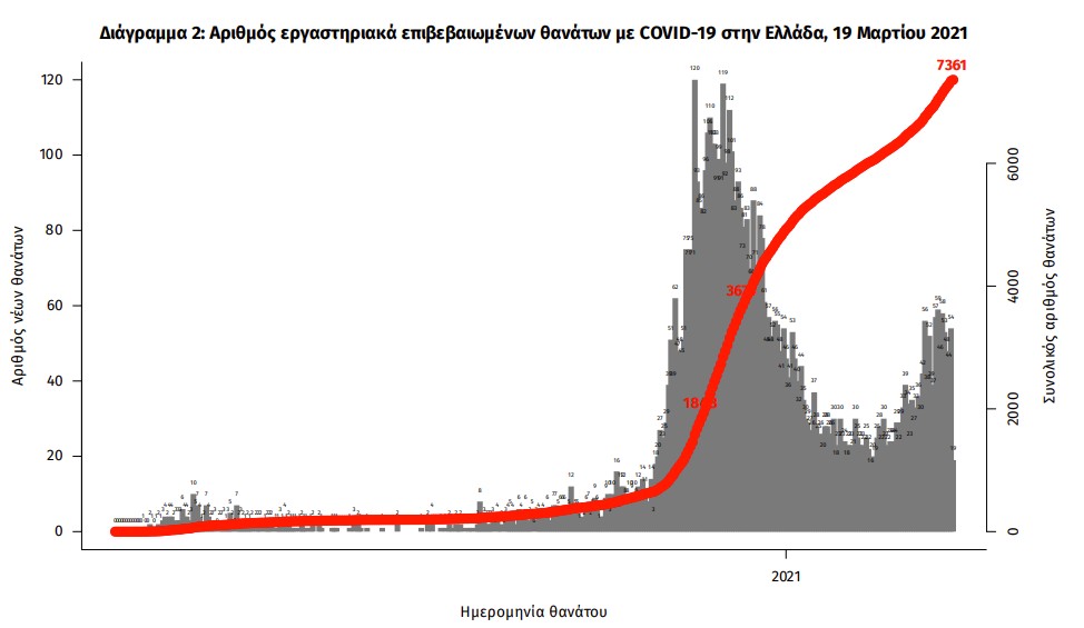 Οι νέοι θάνατοι ασθενών με COVID-19 είναι 64, ενώ από την έναρξη της επιδημίας έχουν καταγραφεί συνολικά 7.361 θάνατοι. Το 95.8% είχε υποκείμενο νόσημα ή/και ηλικία 70 ετών και άνω.