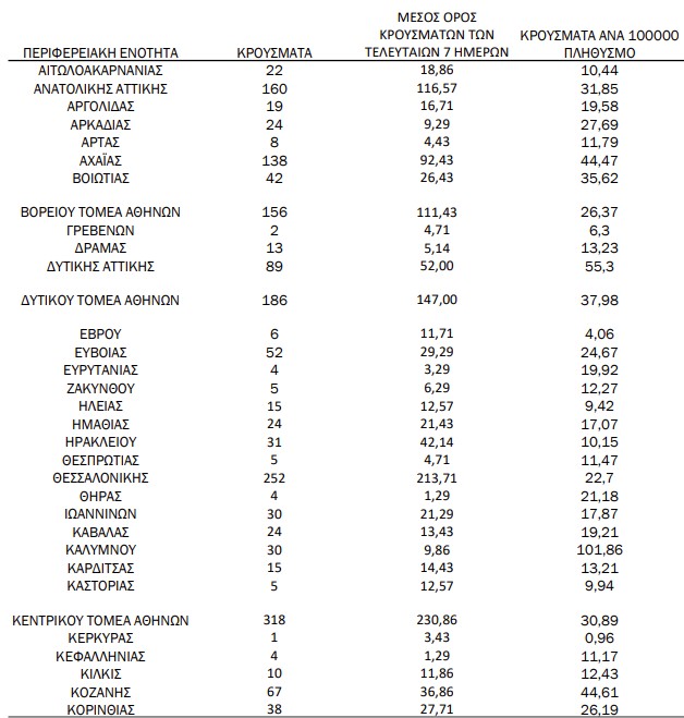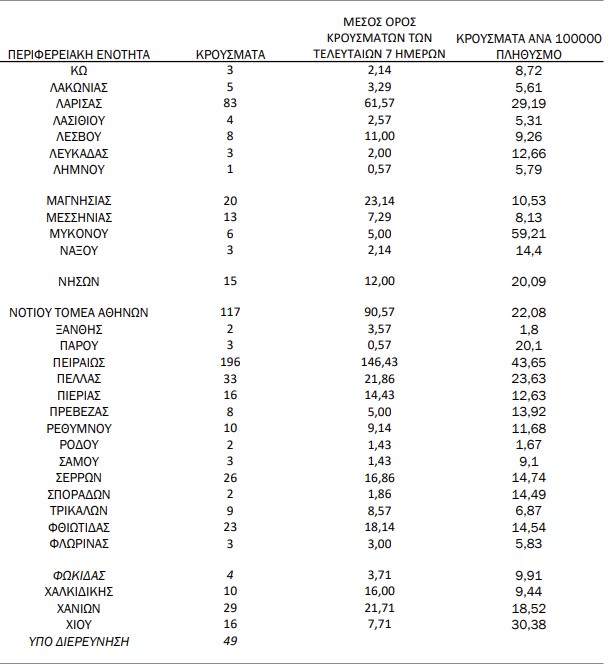 Τέλος, Δυτική Αττική και νησιά του Αργοσαρωνικού καταγράφουν 89 και 15 κρούσματα αντίστοιχα.