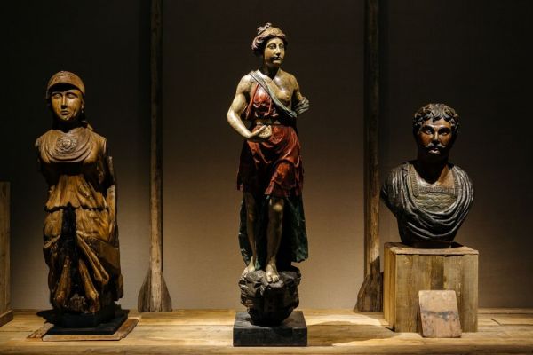 Από τoυς «διαλόγους» των εκθεμάτων, το βλέμμα του επισκέπτη αιχμαλωτίζει η εμβληματική παρουσία του μαρμάρινου αγάλματος της πληγωμένης Αμαζόνας από τα Μουσεία του Καπιτωλίου της Ρώμης, έργο του 2ου αι. μ.Χ., ρωμαϊκο αντίγραφο πρωτότυπου έργου του 5. αι. π.Χ. πιθανότατα του γλύπτη Πολύκλειτου, σε διάλογο με το ξύλινο ακρόπρωρο με μορφή Αμαζόνας, έργο του Γάλλου Douin Pete του τέλους του 18ου αιώνα, από τη Συλλογή Μαρτίνου. Το μικρό λίθινο άγαλμα Αθηνάς του 2ου αι. μ.Χ., από την Αρχαία Ελεύθερνα και το Αρχαιολογικό Μουσείο του Ρεθύμνου, συνδιαλέγεται με το ακρόπρωρο με τη μορφή Αθηνάς, των αρχών του 19ου αιώνα της Συλλογής Μαρτίνου. Το εκμαγείο με την προτομή του Στρατηγού Θεμιστοκλή του 2ου αι. μ.Χ. από το Αρχαιολογικό Μουσείο της Όστια ανακαλεί το ακρόπρωρο με προτομή του Θεμιστοκλή των αρχών του 19ου αιώνα της Συλλογής, ενώ το αγαλμάτιο του Οδυσσέα, αντίγραφο της Ρωμαϊκής Αυτοκρατορικής Εποχής από το Εθνικό Αρχαιολογικό Μουσείο της Βενετίας συνομιλεί με το γλυπτό του Οδυσσέα Ανδρούτσου με τον σκύλο του, του Βenedetto Sangiovanni του 1836. Τέλος, η ερμαϊκή στήλη της Σαπφούς που φέρει την επιγραφή «ΣΑΠΦΩ ΕΡΕΣΙΑ» του 1ου αι. μ.Χ. από τα Μουσεία του Καπιτωλίου της Ρώμης και η Αττική ερυθρόμορφη υδρία με παράσταση γυναίκας μουσικού (Σαπφούς) του 440 – 430 π.Χ. από το Εθνικό Αρχαιολογικό Μουσείο συνδιαλέγονται με το επιτραπέζιο ρολόι Η Madame de Stael ως Σαπφώ, του 1830, της Συλλογής.