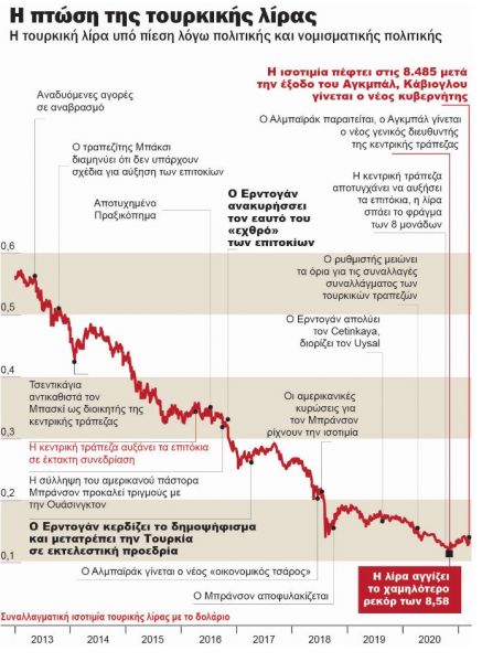 Αυτό μπορεί να εξηγήσει τις διαρκείς παλινωδίες τα τελευταία χρόνια σε σχέση με την οικονομική πολιτική, που αποτυπώνονται και στις συχνές αλλαγές διοικητή της Κεντρικής Τράπεζας. Τον Νοέμβριο του 2020 με την τουρκική λίρα να έχει υποχωρήσει σημαντικά σε όλη τη διάρκεια από τον Ιανουάριο του 2020, ο Ερντογάν απέπεμψε τον Μουράτ Ουϊσάλ διοικητή της κεντρικής τράπεζας από τον Ιούλιο του 2019 και στη θέση του τοποθέτησε τον Νατσί Αγκμπάλ, πρώην υπουργό Οικονομικών.