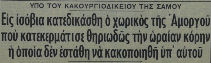 Στις 23 Ιουνίου 1961 έγινε η δίκη στο Κακουργιοδικείο της Σάμου. Η απόφαση ήταν η ισόβια κάθειρξη, η οποία είχε θεωρηθεί από τον Τύπο εποχής επιεικής για ένα τόσο αποκρουστικό και άγριο έγκλημα. Μάλιστα, επέκριναν τους ενόρκους και φέρονταν κατά του θεσμού των ορκωτών δικαστών. Ο εισαγγελέας Πρωτόδικων Σάμου άσκησε αναίρεση λίγους μήνες μετά, ενώπιον του Αρείου Πάγου. Υποστήριξε πως το συγκεκριμένο έγκλημα και ο τρόπος που διαπράχθηκε επιβάλλουν στον κατηγορούμενο την ποινή του θανάτου και όχι την ισόβια κάθειρξη. Η αναθεώρηση της δίκης δηλαδή, αφορούσε στην ποινή και όχι στην ετυμηγορία των ενόρκων.