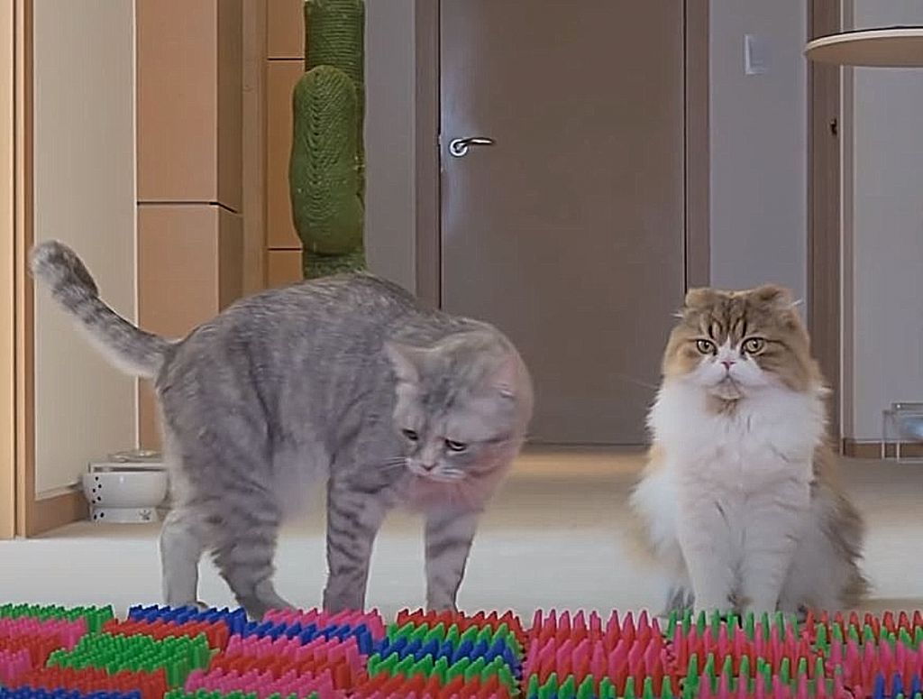 Τι γίνεται όμως όταν βλέπουν μπροστά τους έναν γιγαντιαίο όγκο από χτένες γατιών; Πώς διαχειρίζονται το όλο θέαμα (που τους αλλάζει τον χώρο) και κατά πόσο ξεπερνούν τα εμπόδια ως γνήσια αιλουροειδή;