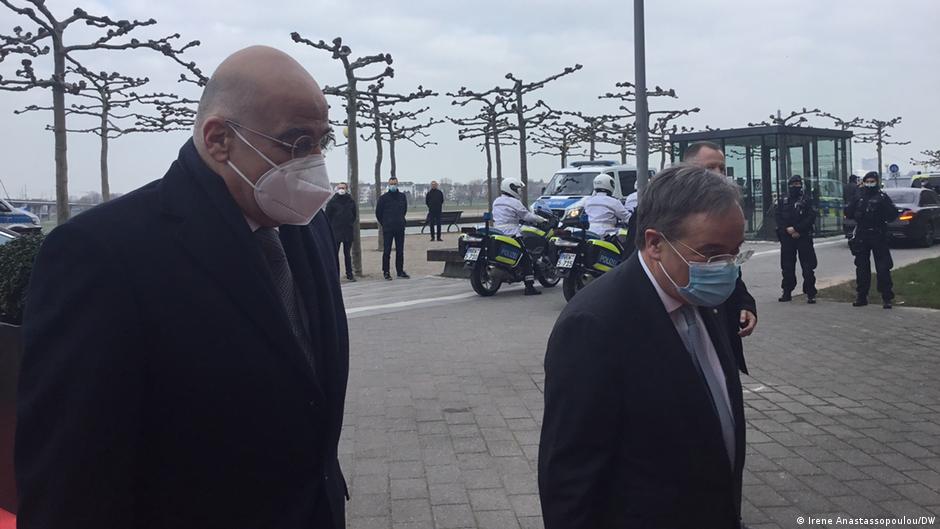 Ο τοπικός πρωθυπουργός Αρμιν Λάσετ προϋπάντησε τον Νίκο Δένδια στο κατώφλι της καγκελαρίας για ανταλλαγή απόψεων μιας ώρας στο γραφείο του με τη μαγευτική θέα στον Ρήνο.