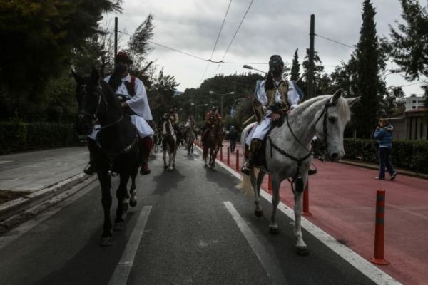 Οι συμμετέχοντες έφιπποι φορούν παραδοσιακές στολές, ενώ αεροσκάφη της Πολεμικής Αεροπορίας κάνουν διελεύσεις στον αττικό ουρανό.