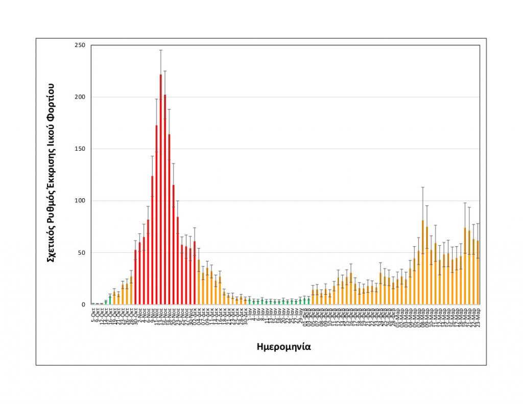 -Μειωμένη κατά 14% σε σχέση με τη μέση τιμή των δύο αμέσως, προηγούμενων μετρήσεων, δηλαδή της Παρασκευής 19/3 και της Κυριακής 21/3.