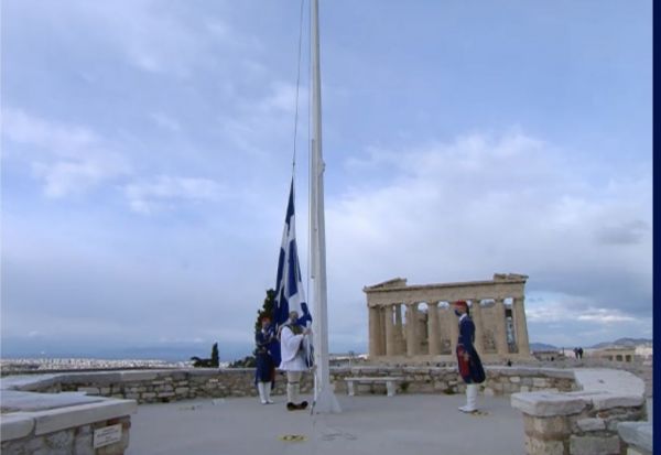 Ξεκίνησε η τελετή της επίσημης έπαρσης της σημαίας στον Ιερό Βράχο της Ακρόπολης, στην οποία θα παραστεί η Πρόεδρος της Δημοκρατίας Κατερίνα Σακελλαροπούλου και ο πρωθυπουργός Κυριάκος Μητσοτάκης.