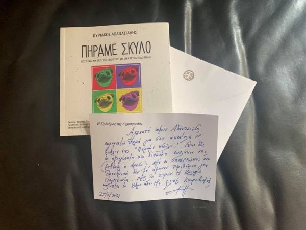 Ευχαριστώ θερμά για την αποστολή του βιβλίου σας «Πήραμε Σκύλο». Έχω δει τα αξιαγάπητα και διάσημα σκυλάκια σας (φοβερός ο Αρσέν), αλλά οι υποχρεώσεις στο Προεδρικό δεν μου αφήνουν περιθώρια για πολυτεκνία…προς το παρόν. Η Καλυψώ καλύπτει το χώρο ήδη. Με φιλικούς χαιρετισμούς,