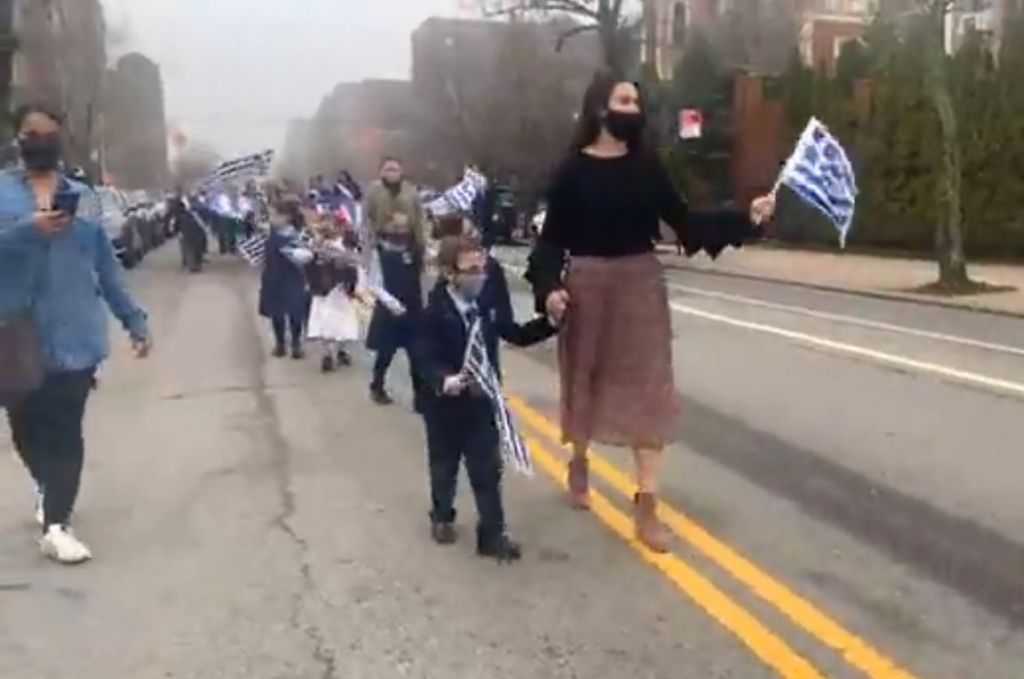 Οι μαθητές του Ημερήσιου σχολείου «Δημήτριος και Γεωργία Καλοειδη» της κοινότητας Τίμιου Σταυρού στο Μπρούκλιν το πρωί της Πέμπτης (25/3) φόρεσαν τις μάσκες τους, πήραν τις ελληνικές σημαίες τους και έκαναν παρέλαση γύρω από το σχολείο τους.