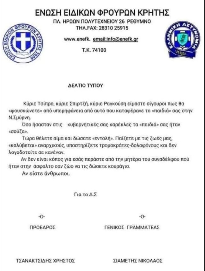 Εν όψει των παραπάνω, ανακαλούμε πλήρως, ρητώς και ευθέως το με χρονολογία 09-03-2021 δελτίο τύπου, δηλώνοντας ταυτόχρονα κατηγορηματικά ότι ουδεμία πρόθεση είχαμε να βλάψουμε την τιμή και την υπόληψη του κ. Τσίπρα, του κ. Σπίρτζη και του κ. Ραγκούση, αλλά, αποκλειστικά εντός των πλαισίων του συνδικαλιστικού μας ρόλου, να εκφράσουμε απερίφραστα την αποδοκιμασία και την καταδίκη αποτρόπαιων πράξεων που σκοπό έχουν να πλήξουν τα αστυνομικά όργανα με κάθε τρόπο (σωματικό, ηθικό, ψυχολογικό). Θεωρούμε εντελώς ατυχή την αναφορά των ως άνω προσώπων εκ μέρους μας, ως προϊόν παραδρομής, η οποία έλαβε χώρα εν μέσω των γεγονότων, των δημοσιευμάτων και υπό την έντονη συναισθηματική φόρτιση που μας προκάλεσε η θέα του αιμόφυρτου και λιπόθυμου στο οδόστρωμα συναδέλφου μας, θεωρώντας ότι θα μπορούσαμε να βρισκόμασταν κάλλιστα στη θέση του. Θα πρέπει δε να σημειωθεί, ότι το συγκεκριμένο δελτίο τύπου αφαιρέθηκε από εμάς αμέσως (εντός των επομένων ωρών), αυτοβούλως και άνευ ετέρου τινός, τόσο από τον επίσημο ιστότοπο της Ένωσης Ειδικών Φρουρών Κρήτης, όσο και από την αντίστοιχη σελίδα της Ένωσης στην διαδικτυακή εφαρμογή Facebook, όπου και είχε δημοσιευτεί.»