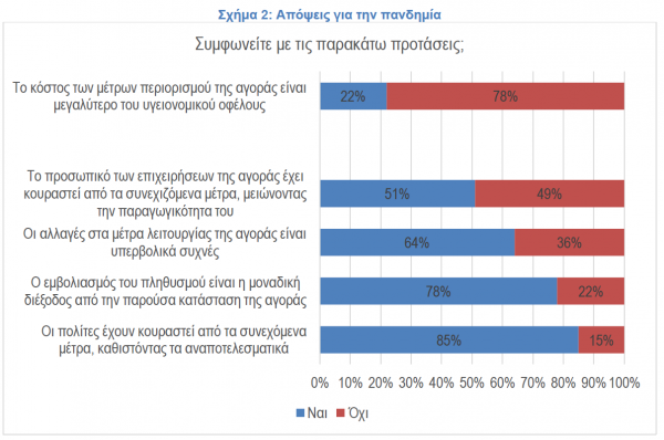Επίσης, ποσοστό 85% θεωρεί ότι οι πολίτες έχουν κουραστεί από τα παρατεταμένα μέτρα και το 51% ότι το προσωπικό των επιχειρήσεων έχει κουραστεί από τα συνεχιζόμενα μέτρα. Τα 2 στα 3 στελέχη θεωρούν ότι οι αλλαγές στα μέτρα, όπως οι αλλαγές στο ωράριο λειτουργίας των καταστημάτων ή οι επιτρεπόμενες κατηγορίες πώλησης, είναι πολύ συχνές. Παρόλα αυτά είναι κοινός τόπος ότι το κόστος από τα μέτρα περιορισμού της λειτουργίας της αγοράς είναι αποδεκτό.
