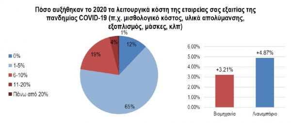 Η διάρκεια και η ένταση της πανδημίας επηρεάζει και την χρηματοοικονομική εικόνα των επιχειρήσεων. Σε σχέση με τη λειτουργία των επιχειρήσεων καταγράφεται μία αρκετά σημαντική αύξηση του λειτουργικού κόστους των επιχειρήσεων. Μόλις το 12% των στελεχών θεωρεί ότι δεν υπάρχει αύξηση στα λειτουργικά κόστη, το 65% εκτιμά αύξηση 1-5% και το υπόλοιπο 23% πάνω από 5%. Συγκεκριμένα, οι ερωτώμενοι εκτιμούν ότι μεσοσταθμικά τα λειτουργικά τους κόστη έχουν αυξηθεί κατά 4,01%. Το ποσοστό αυτό είναι αρκετά υψηλότερο για τα στελέχη του λιανεμπορίου στο 4,87% και χαμηλότερο για την βιομηχανία με 3,21%.