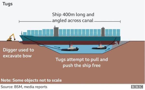 Πρόκειται για «εργαλεία» που δεν αποτελούν σπάνιο θέαμα στο Κανάλι του Σουέζ, όπως λέει ο ειδικός σε ναυτιλιακά θέματα Σαλ Μερκολιάνο, και χρησιμοποιούνται συχνά για να κρατούν την πλωτή οδό ανοιχτή.