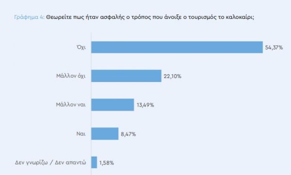 Αντίστοιχα αρνητική είναι η αξιολόγηση σχετικά με τον τρόπο που άνοιξε ο τουρισμός το προηγούμενο καλοκαίρι (76,5%), αλλά και την μέθοδο του click away (71,1%).