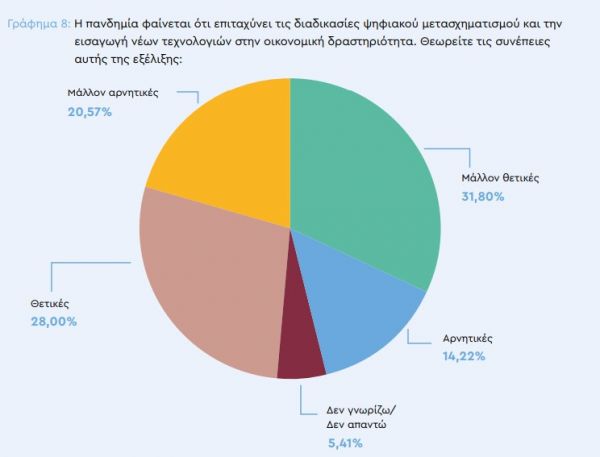 Η πανδημική κρίση φαίνεται πως επιταχύνει τον ψηφιακό μετασχηματισμό της οικονομίας. Από την έρευνα φαίνεται ότι επικρατεί αισιοδοξία, αφού το 59,8% του δείγματος θεωρεί ότι οι συνέπειες αυτής της εξέλιξης θα είναι θετικές. Αυτοί που ανήκουν στις υψηλότερες εισοδηματικά κατηγορίες και έχουν υψηλότερο εκπαιδευτικό επίπεδο είναι περισσότερο αισιόδοξοι. Αντίθετα, φαίνεται ότι ο ψηφιακός μετασχηματισμός ανησυχεί περισσότερο αυτούς που είναι λιγότερο προετοιμασμένοι να προσαρμοστούν σε αυτόν.