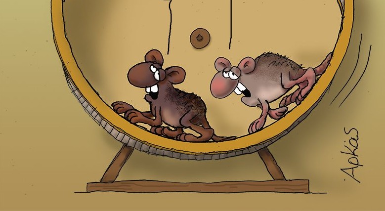 Ο σκιτσογράφος με το καυστικό χιούμορ στο σημερινό σκίτσο του βάζει δύο ποντίκια να τρέχουν πάνω σε μια ρόδα και να σχολιάζουν: