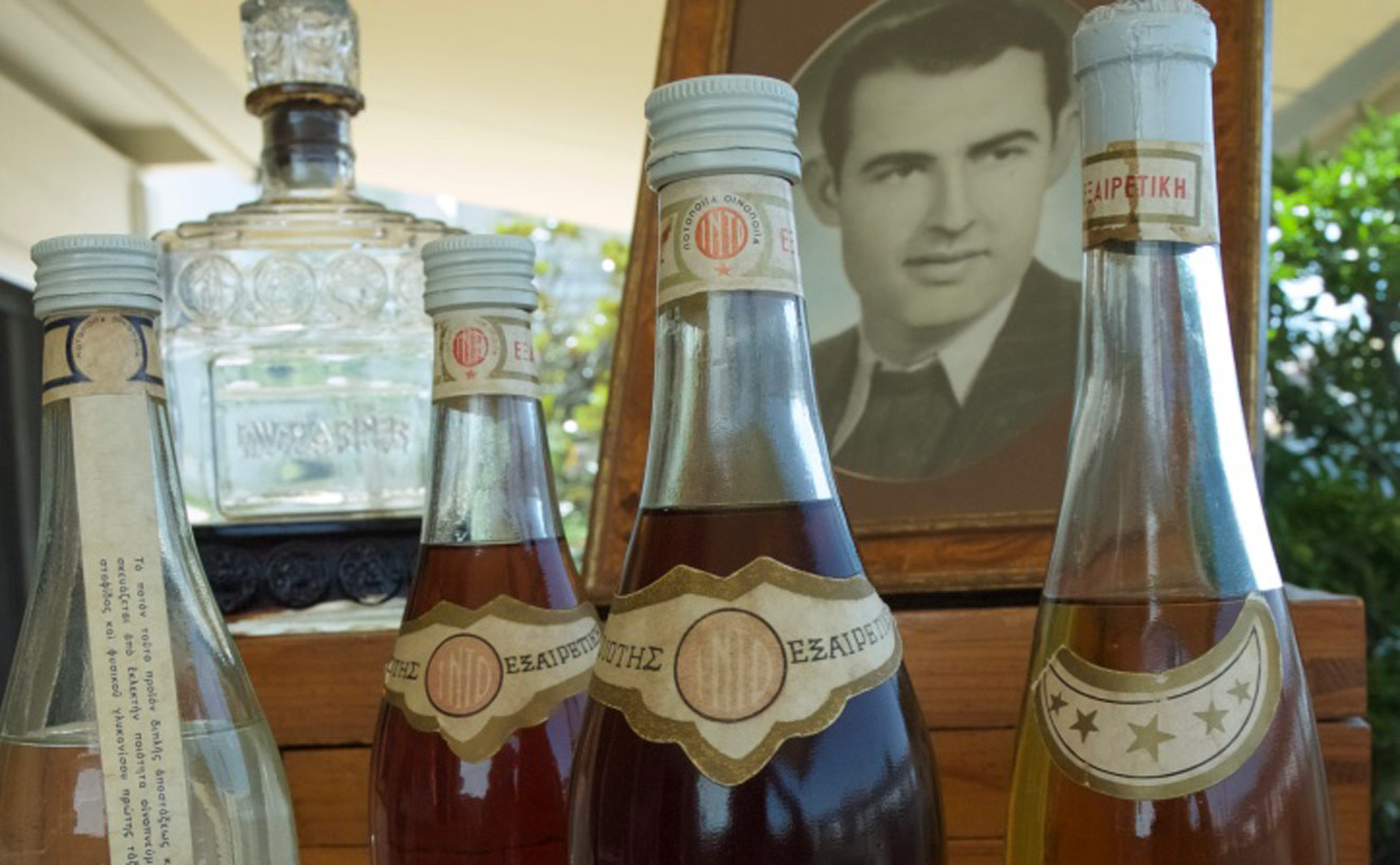 Τέσσερα από τα μπουκάλοα της ποτοποιείας ΙΝΤΟ: Ούζο, Cherry Brandy, Tantura (γαρύφαλλο) και Brandy