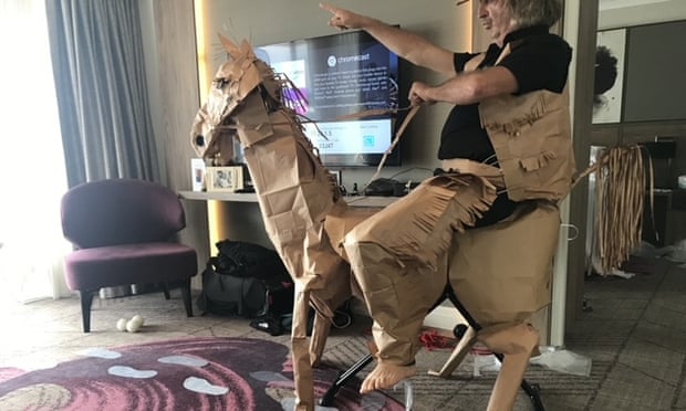 Από τα ίδια υλικά αποτελείται και ο Ράσελ, το άλογό του: Οι χαρτοσακούλες συνθέτουν το «δέρμα» του, που στηρίζεται πάνω σε μια σιδερώστρα και ένα πορτατίφ.