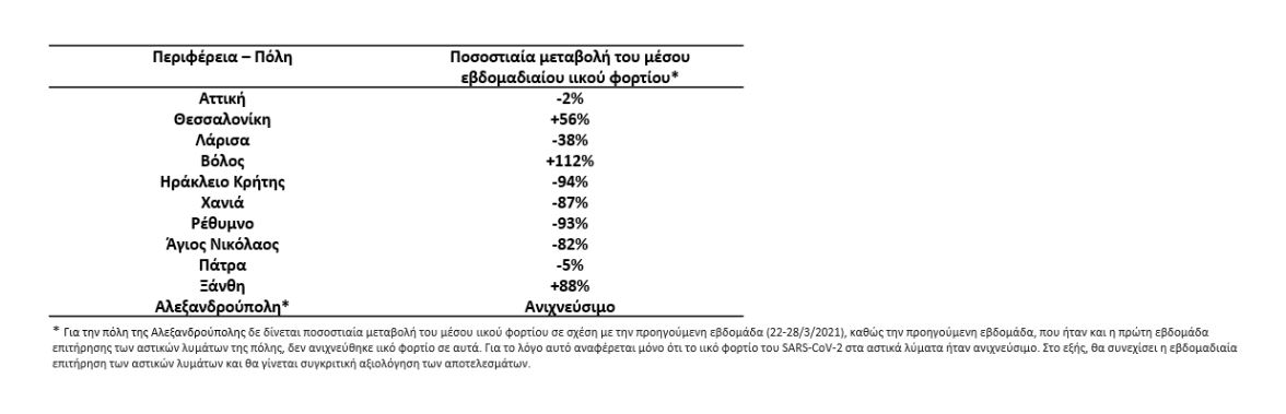 Την εβδομάδα 29 Μαρτίου – 4 Απριλίου 2021 παρατηρήθηκαν σταθεροποιητικές ή πτωτικές τάσεις σε σχέση με την εβδομάδα 22-28 Μαρτίου 2021 στο ιικό φορτίο του SARS-CoV-2 στα αστικά λύματα των 7 από τις 11 περιοχές που ελέγχονται από το Εθνικό Δίκτυο Επιδημιολογίας Λυμάτων του ΕΟΔΥ. Οι πτωτικές τάσεις κυμαίνονται από –2% στην Περιφέρεια Αττικής μέχρι –94% στα Χανιά.