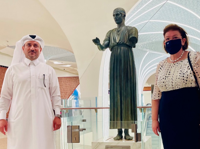 Η επίσημη τελετή εγκαινίων της έκθεσης του αντιγράφου του Ηνιόχου, το οποίο αποτελεί δώρο της Ελληνικής Κυβέρνησης στο Κατάρ, πραγματοποιήθηκε χθες το πρωί. Τα αποκαλυπτήρια του αγάλματος έγιναν από την Υπουργό Πολιτισμού και Αθλητισμού Λίνα Μενδώνη, στο πλαίσιο της επίσημης επίσκεψής της στο Κατάρ, και από τον Γενικό Διευθυντή της Αρχής των Μουσείων του Κατάρ, Ahmad Al-Namla.