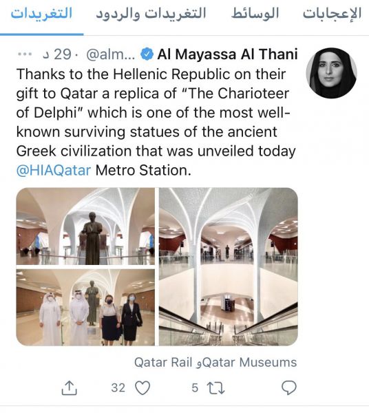 Το ακριβές αντίγραφο του Ηνιόχου των Δελφών, ενός από τα γνωστότερα αγάλματα της κλασικής γλυπτικής τέχνης, κοσμεί πλέον τον κεντρικό σταθμό του Μετρό στο διεθνές αεροδρόμιο της Ντόχα, στο Κατάρ