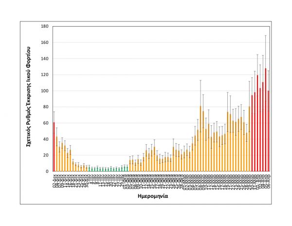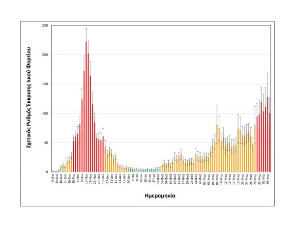 Όπως, εξάλλου, ανακοινώθηκε από τον ΕΟΔΥ, την εβδομάδα 29/3-4/4/2021 παρατηρήθηκε αύξηση (+56%) στον σχετικό ρυθμό έκκρισης του ιικού φορτίου, σε σχέση με την προηγούμενη εβδομάδα, 22-28/3/2021.